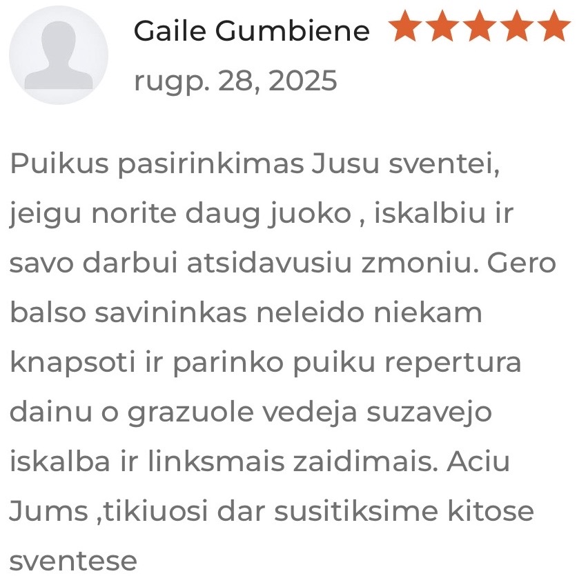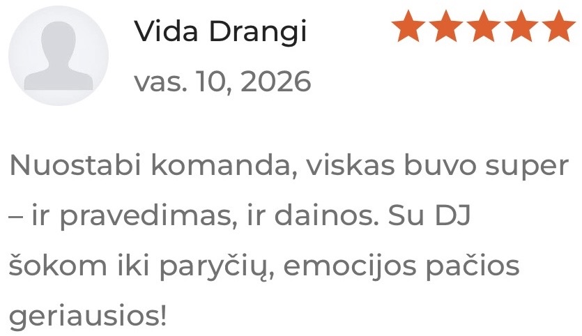 Arnis – Profesionalus DJ, kuris muzika ir kokybiška garso aparatūra kuria nepamirštamas renginių akimirkas. Jis gali pasiūlyti platų muzikos stilių pasirinkimą ir individualų požiūrį, kad kiekviena šventė atspindėtų būtent jūsų skonį ir norus. Naudojama moderni profesionali įranga, kuri užtikrina sklandų ir kokybišką garsą net ir didžiausiose erdvėse.